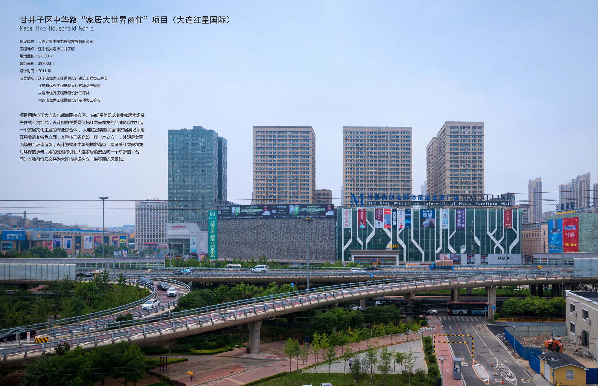 项目用地位于大连市东部商圈核心区。 由红星美凯龙专业家居卖场及居住式公寓组成,设计构思主要是依托红星美凯龙的品牌影响力打造一个家居文化主题的商业综合体 。大连红星美凯龙国际家居卖场采用红星美凯龙特色立面,其整体形象宛如一座“水立方”,外观是壮丽流畅的全玻璃造型,设计为树和木块的抽象造型,象征着红星美凯龙对环保的承诺,她的亮相将引领大连家居消费迈向一个崭新的平台,同时其独有气质必将为大连市建设树立一道亮丽的风景线。