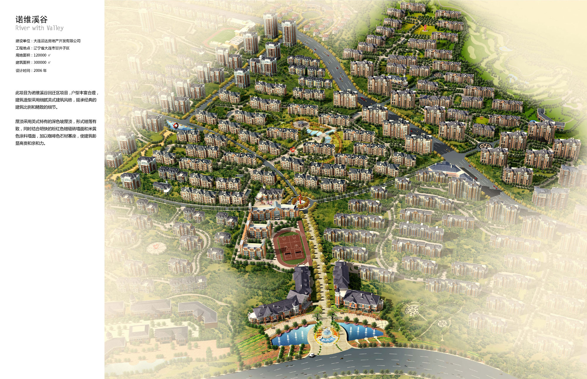 此项目为诺维溪谷回迁区项目,户型丰富合理,建筑造型采用细腻英式建筑风格,延承经典的建筑比例和精致的细节。屋顶采用英式特有的深色坡屋顶,形式错落有致,同时结合明快的粉红色错缝砖墙面和米黄色涂料墙面,加以咖啡色石材基座,使建筑彰
